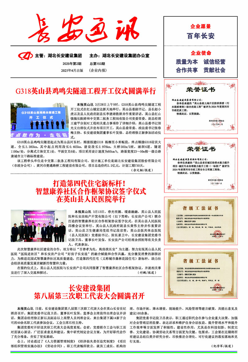 • 2025-11-03 長安建設集團聘任徐正新同志為湖北長安建設集團股份有限公司總經理、余招剛同志為英山縣長安房地產開發有限公司總經理